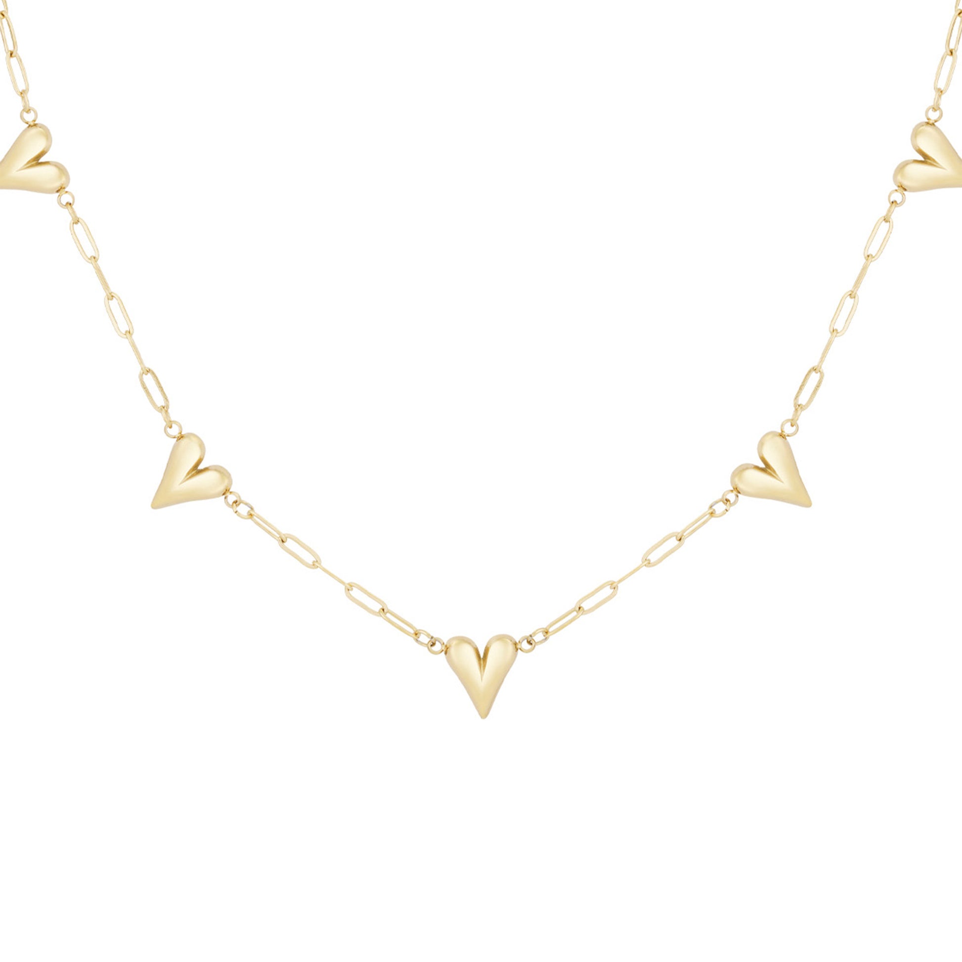 Stijlvolle zilverkleurige ketting van roestvrij staal met 5 verbonden hartjes – symbool voor liefde en verbondenheid. Waterbestendig, hypoallergeen en perfect voor elke dag.