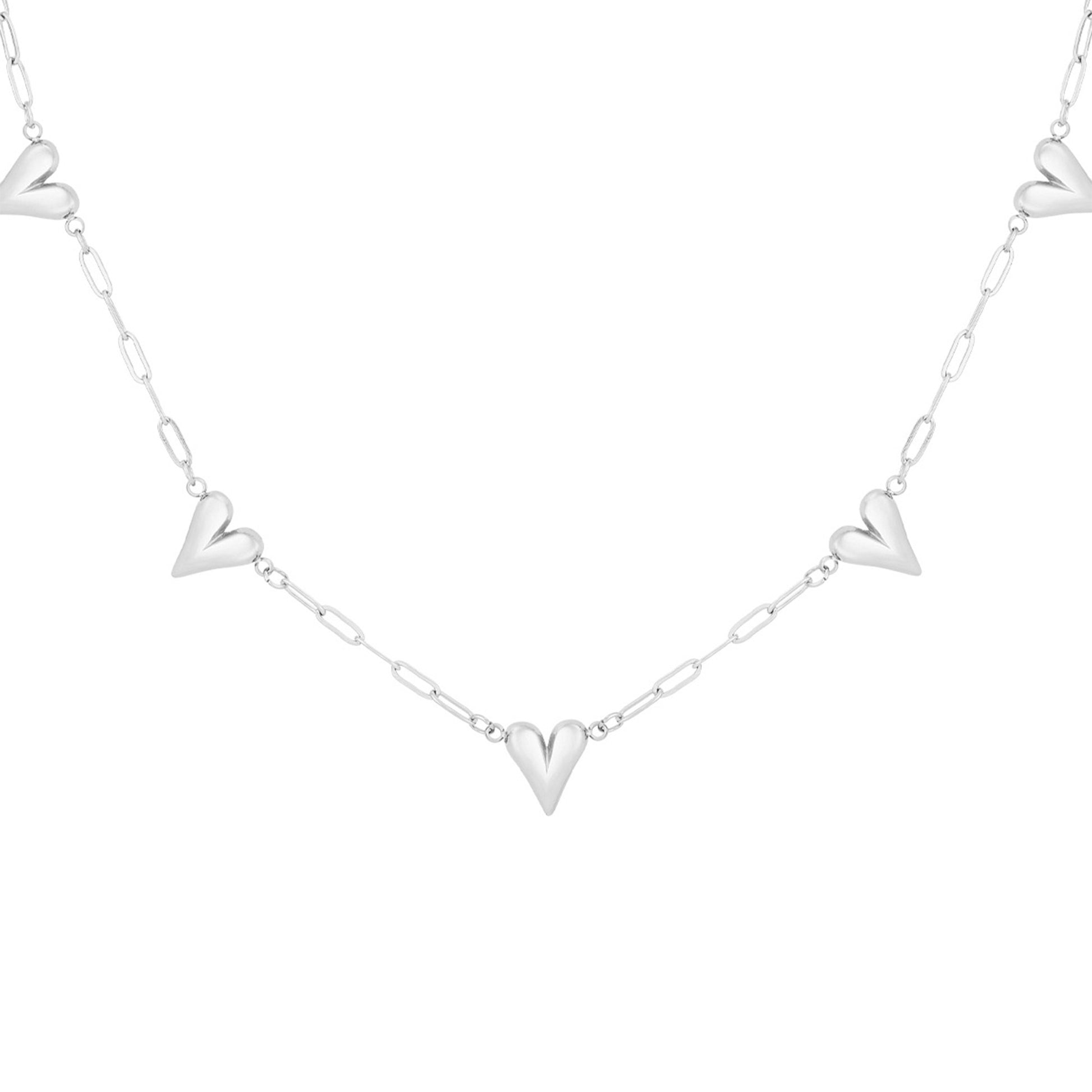 Stijlvolle zilverkleurige ketting van roestvrij staal met 5 verbonden hartjes – symbool voor liefde en verbondenheid. Waterbestendig, hypoallergeen en perfect voor elke dag.